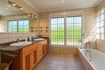 bagno en-suite con doppio lavabo, vasca, doccia, toilette e asciugacapelli
