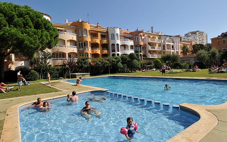 Appartamenti confortevoli con aria condizionata per quattro persone. Distribuito in una camera con due letti singoli e due divani letto singoli. Hanno un bagno con doccia piena. Cucina attrezzata Circondato da un ampio giardino con diverse piscine comunitarie, sia per adulti e bambini. Hanno anche un'area per bambini. Dalla terrazza si può godere una splendida vista sul giardino. Wifi incluso. Possibilità di parcheggio. Downtown ea soli 150 metri dalla spiaggia. Ristorante esclusivo e minigolf per i clienti. Ricezione. Tutti i tipi di servizi nell'ambiente. Ambiente molto tranquillo e residenziale. Ideale per famiglie.